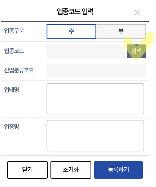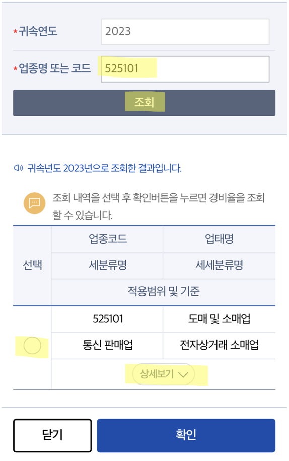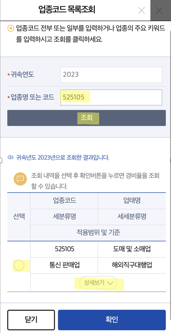 7. 부업종 입력하기 (업종코드 525101)으로 조회하여 전자상거래 소매업 확인 후 상세조회 눌러서 마지막 산업코드(47912)로 선택하기