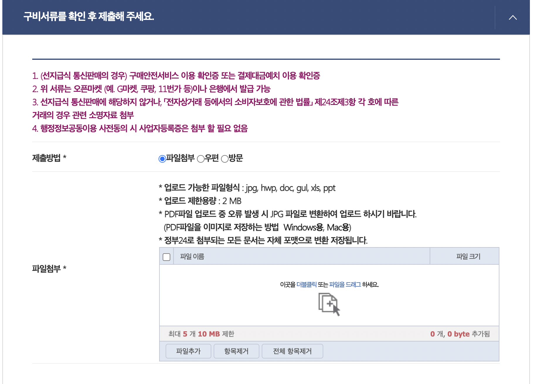 구비서류 첨부에 "구매안전서비스 확인증" 파일을 업로드해줍니다. pdf파일이 첨부되지 않으면 jpg파일로 변환하여 첨부합니다. 본인이 편한 수령방법으로 선택합니다. 방문하는 것보다 인터넷으로 발급하면 방문 없이 출력하거나 동일하게 파일로 받을 수 있으니 온라인 발급을 추천드립니다.